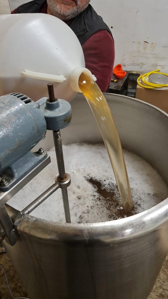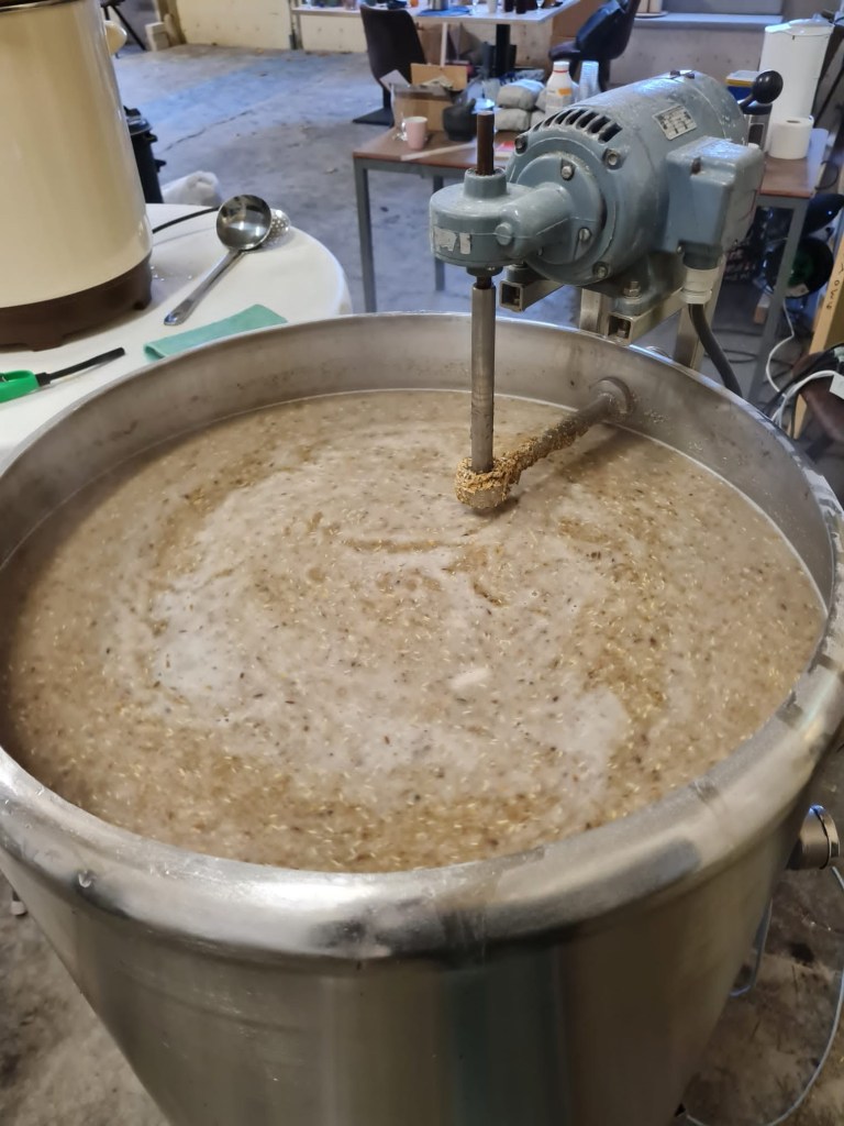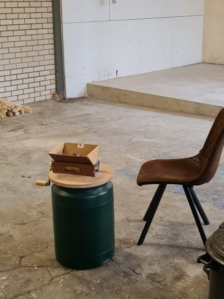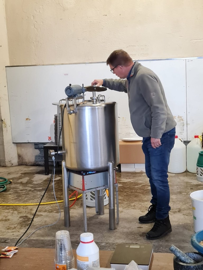 Zaterdag 6 november was het zover. In het FraterLab werd 120 liter water old school opgewarmd met een gasbrander. Daarboven de prachtige ketel van Erik en Anjo. In deze unit werd ooit Karvan Cevitam bereid. Toen de siroopfabriek uit Veenendaal vertrok kwam de rvs ketel beschikbaar. Hij werd omgebouwd tot een puike installatie om het maisch- en kookproces voor ambachtelijk bier te dienen.