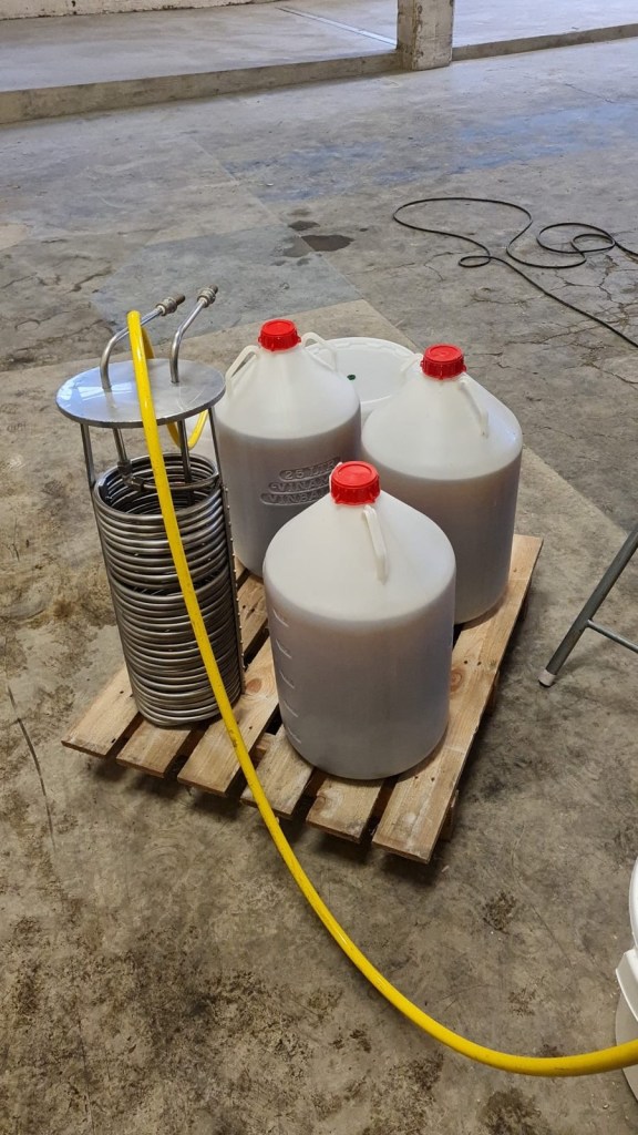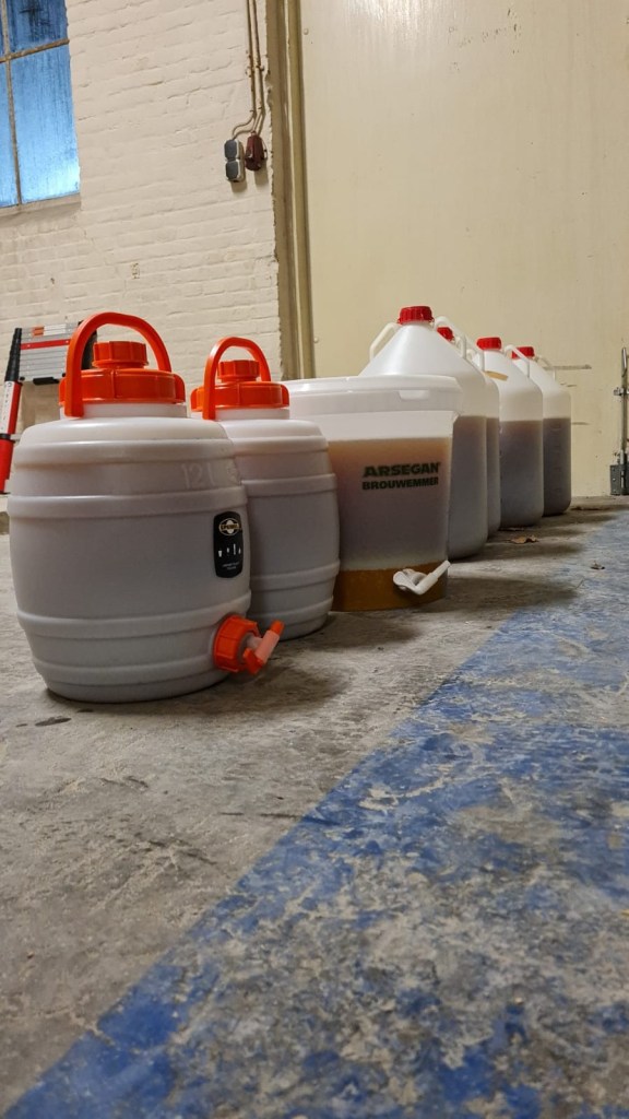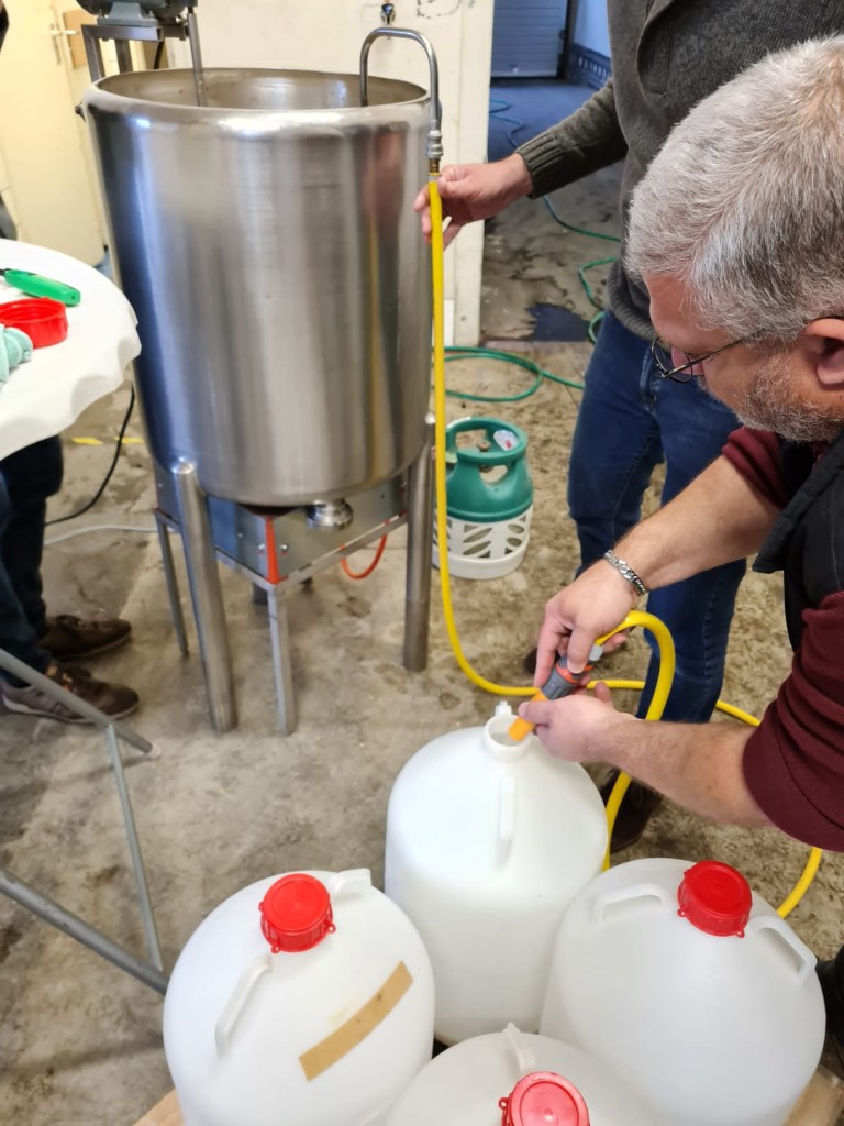 Nu ging eindelijk de vlam onder de pan. 3 soorten mout, en nog wat geheimen van de kok. En niet te vergeten hop van Wapenveldse bodem, o.a. Kent Golding. Het werd een lange brouwdag. 7 vaten vol met tripel bier was het resultaat. Dit is in essentie wat een brouwgilde is. Samen brouwen, samen wachten, en dan twee weken later samen bottelen. O ja, en dan samen proeven. En dan nog eens.